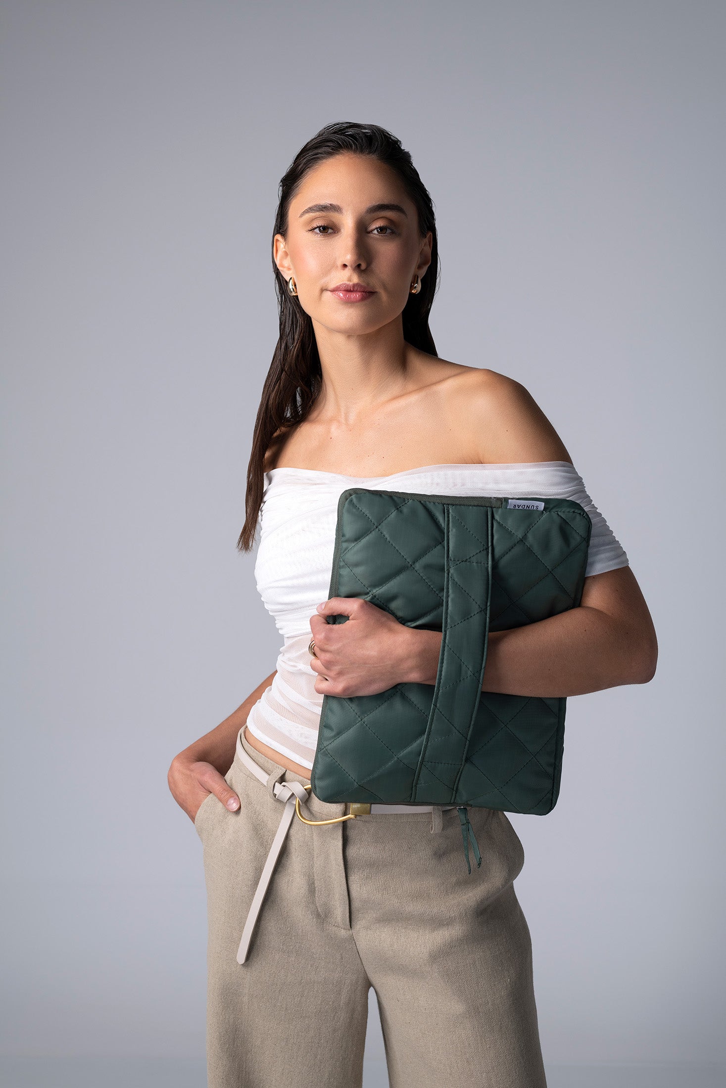 Fabricada con material de larga durabilidad, cierre de cremallera, compartimento para computadora portátil de 13", 2 bolsillos frontales con cierre, dos compartimentos exteriores laterales, correa interna con bandola multiusos. Tira de sujeción en la parte posterior para deslizar sobre el asa de la maleta. Incluye bolsa guardapolvo. Lavar a mano con jabón suave.